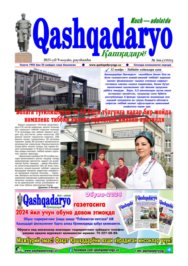 Qashqadaryo gazetasining 2023 yil 9 noyabrdagi №046(15924) – sonida Respublika ixtisoslashtirilgan kardiologiya ilmiy-amaliy tibbiyot markazi Qarshi filialida amalga oshirilgan ishlar va mavjud imkoniyatlar borasida so‘z boradi.