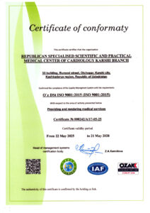 Respublika ixtisoslashtirilgan kardiologiya ilmiy-amaliy tibbiyot markazi Qarshi filiali o‘z faoliyatida halqaro sifat standartlarini joriy etish va amalda tatbiq qilish maqsadida halqaro sifat menejment tizimining asosiy mezoni bo‘lib xizmat qiluvchi ISO 9001:2015 sertifikatiga ega bo‘ldi.